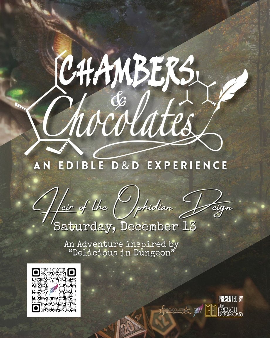 Come join us for the fourth Chocolates & Chambers Edible D&D adventure! Please let us know if you have any dietary restrictions or preferences. This session will be a fully coursed meal, and will contain gluten, meat, and dairy.